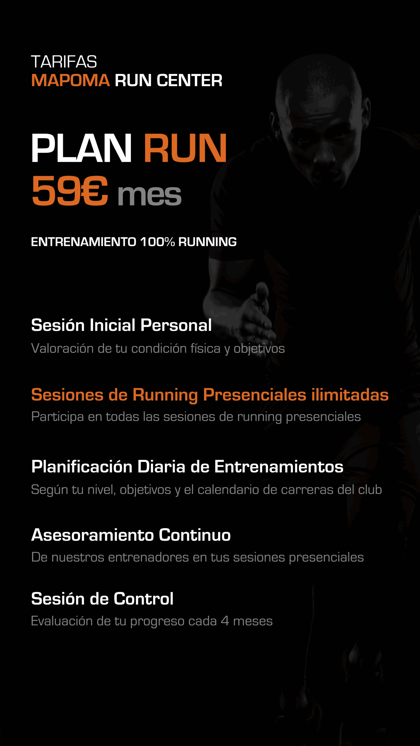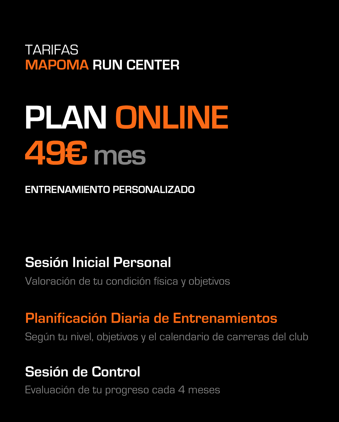 ONLINE: Escríbenos un correo electrónico a runcenter@mapoma.es y nos pondremos en contacto contigo lo antes posible para asesorarte sobre el plan de entrenamiento que se adapte a tus necesidades.