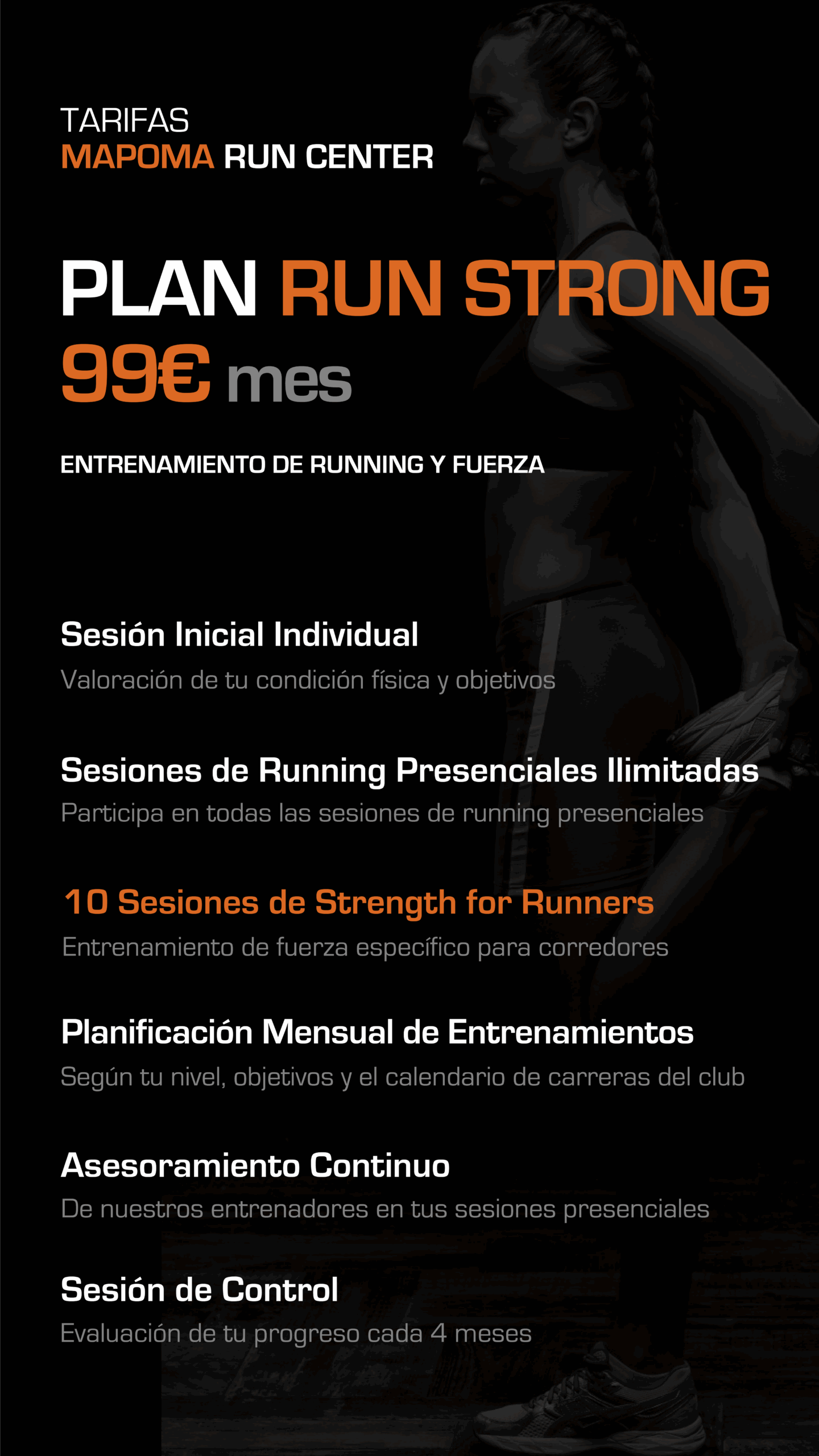 Para que te hagas una idea, tendremos sesiones de técnica de carrera, series, tiradas largas, cuestas, escaleras, clases de fuerza, movilidad, etc.